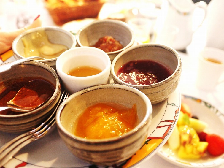 5種類のコンフィチュールと兵庫県産の栗のハチミツ。