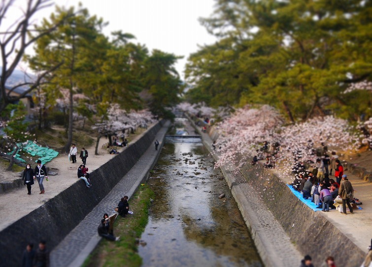 神戸の三宮から特急で二駅ほどいったところにある夙川公園は川の両側に花見客が