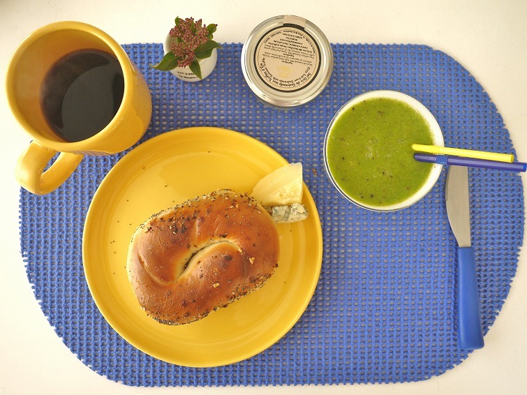はあちゅうまま手作りのブルーベリーピーナッツバターベーグル、なんかのパン切れ、チーズ2種類、グリーンスムージー