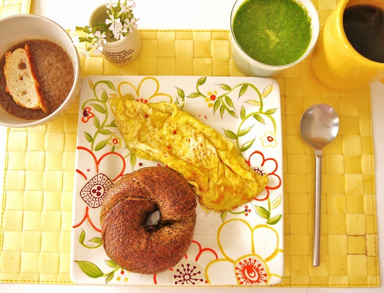 ファームキャンパスさんの有精卵の玉子で作ったプレーンオムレツ、オニオングラタンスープにコーヒー、グリーンスムージー。