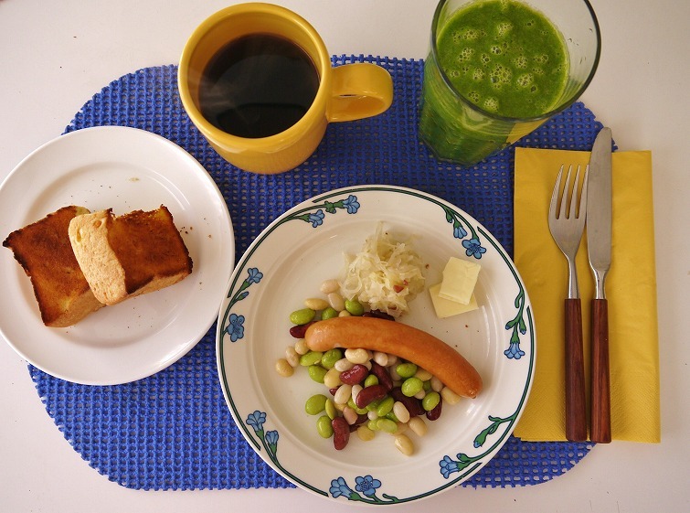 ご近所さんの手作りパンと、ソーセージ、ミックスビーンズ、サワークラフト、チーズ、コーヒー、グリーンスムージー。