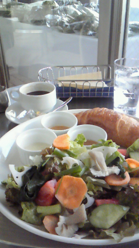 サラダプレートは有機野菜、ドレッシング3種類、焼きたてクロワッサン、スープ、ドリンク…