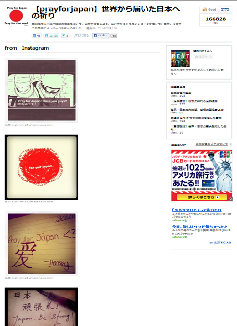 PrayforJapan という1つのキーワードをもとに世界中からの祈りの声を見ることができ