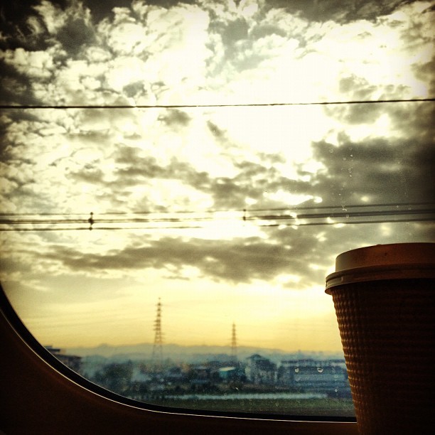 これ11日前の早朝、新幹線で神戸から東京へ向かう途中に撮った朝やけと。