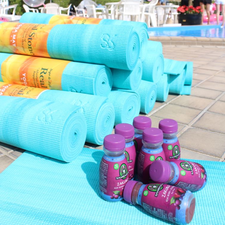 ピンクに映えるスカイブルーのヨガマットは大人気のヨガウェアブランドRealStone様より。
