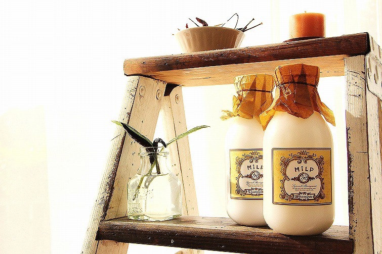 おみやげでいただいたミルクボトルのシャンプーリンスが可愛いのでしばらくお部屋に飾っておくことにしました。