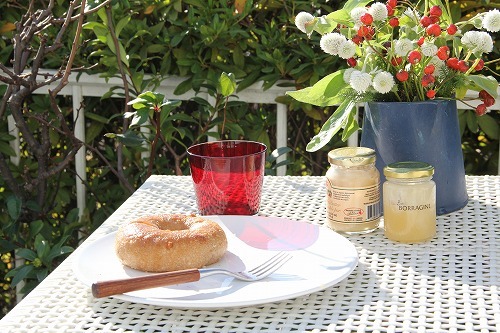 休みの朝は庭のテーブルでベーグルを食べました。